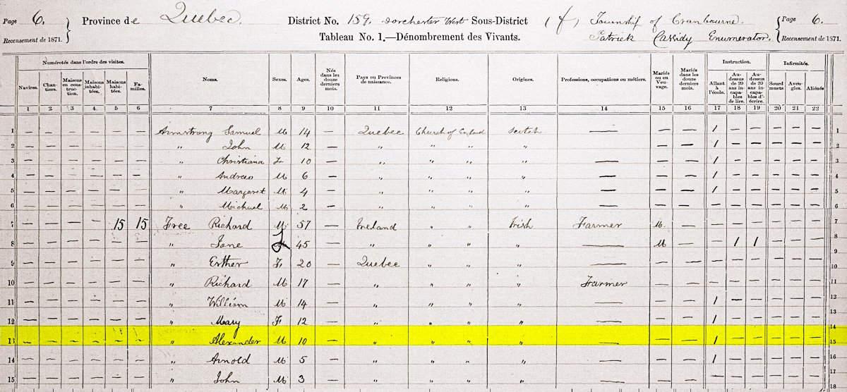 John Free Male 13 1868 Quebec Irish Irish Church of England Cranbourne