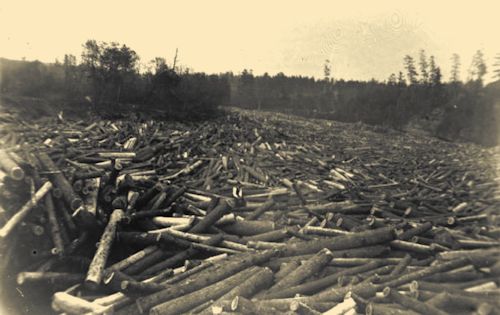 Copy photograph of a log jam on a river. A lone logger is sitting in the center.