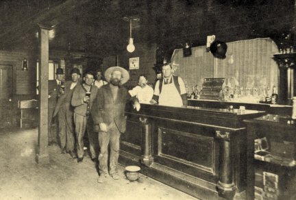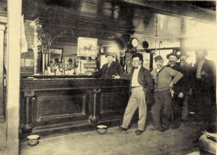 L to R: George Chamness, Unknown, Jake Weingartner, Otto Sauter (behind the bar), Unknown, Mr. Swan and Dick Helms. The mosquito netting was hung over the mirror to protect it from flies Saloons or taverns were numerous in Dorchester in the early years and were the meeting place for the townspeople and farmers to gather and find out the latest news. Only men were allowed in the bar-rooms which typically had wood floors, hanging lanterns and no stools to sit on. The ladies were required to sit in a separate room just off the bar-room in what was referred to as the "Wine Room." They also found time for a practical joke. The story is told about the man that fell asleep in front of a local saloon, and upon waking, found his shoes nailed to the wooden sidewalk. ----Source: Historical Sketches of Dorchester, Wisconsin (1873-1973)