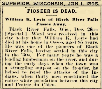 William K. Levis, a pioneer, was born in Bucks Co., PA in 1814 and there married Mary Blanchard, who was born in 1823. He cam to Black River Falls, WI, in 1846, and operated a sawmill there until 1860. Then he moved to Alam Center, Jackson County. From there, in 1867, he moved to Trempeleau County, and settled on a farm some two miles north of Osseo. After a long and useful life on the farm he moved to the village in 1890, where he died in 1898, his wife surviving until 1907. History of Trempealeau Co., WI
