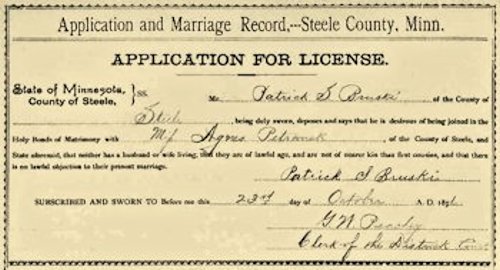 Husband: Patrick S Bruski Marriage Date 27 Oct 1896 Event Place Steele, Minnesota, United States Spouse's Name Agnes Petranek Spouse's Titles and Terms Miss Spouse's Gender Female Page 136