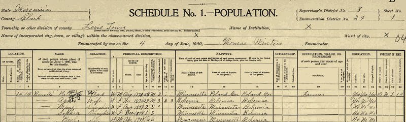 1900 Federal Census, Levis & Washburn towns, Clark, Wisconsin, United States