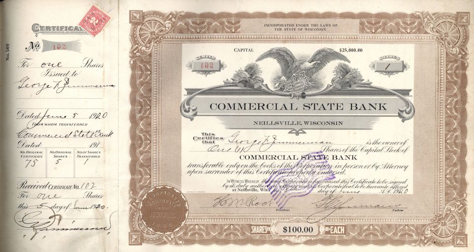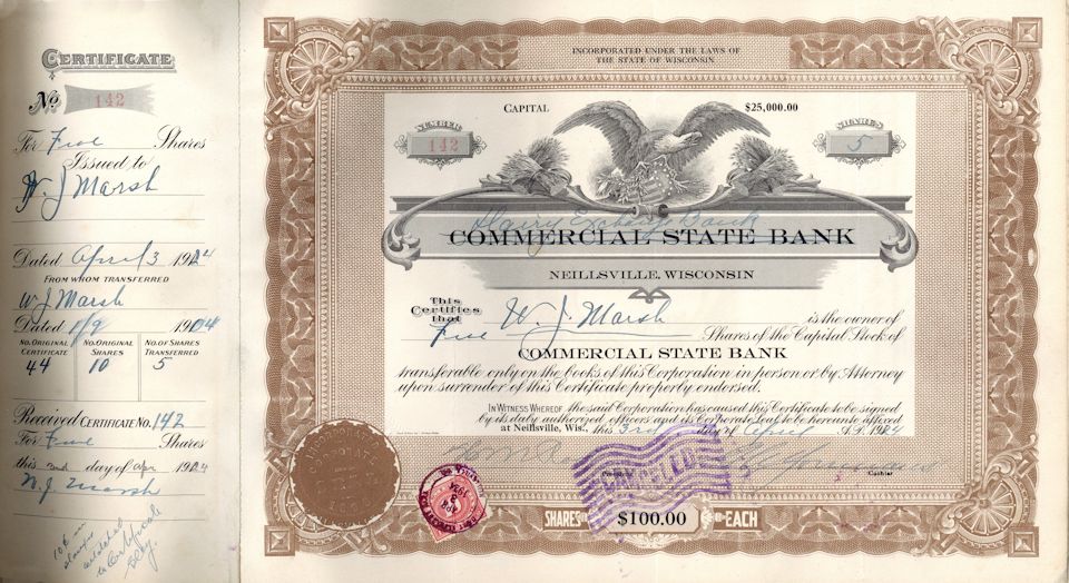 Stock certificates for the Commercial State Bank go from #1 to #141 which are