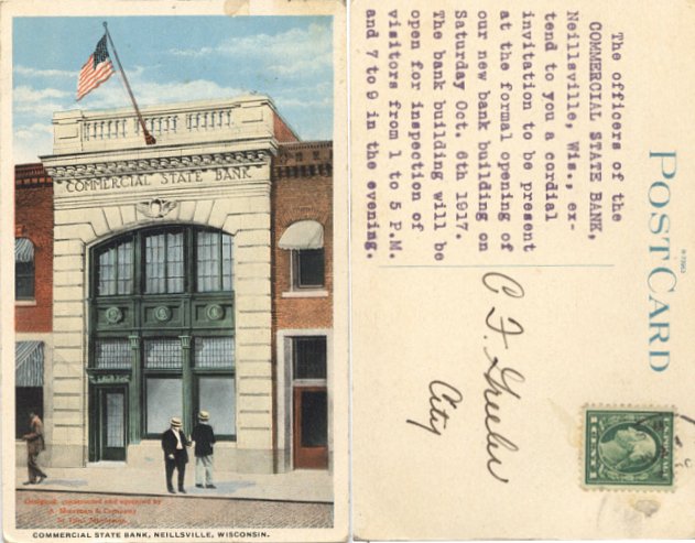 The impressive postcard of the Commercial State Bank in Neillsville bears the message: