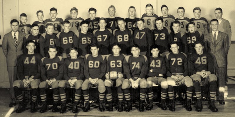 I am pretty sure the coach in the photo is Ted Kafka and that #70 is one of the Devine boys, but am uncertain which one. I'm planning to ask my Dad as he May be able to identify more of the people and tell us which Devine that is too.