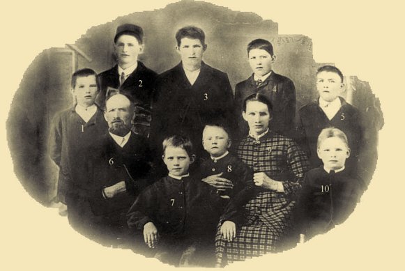 Pictured above: [1]--Morris Lauritz, 10 yrs.; [2]--Otto S., (image added in later years); [3]--John Louis, 15 yrs.; [4]--Oluf Thomas, 17 yrs.; [5]--Anton Emil, 6 yrs.; [6]--Arne C. Olson "Father", abt. 45 yrs.; [7]--Julius, 9 yrs.; [8]--Andrew Frederick, 6 yrs.; [9]--Ellen (Johnson) Olson "Mother" about 45 yrs.; [10]--Peter Moses, 11 yrs.