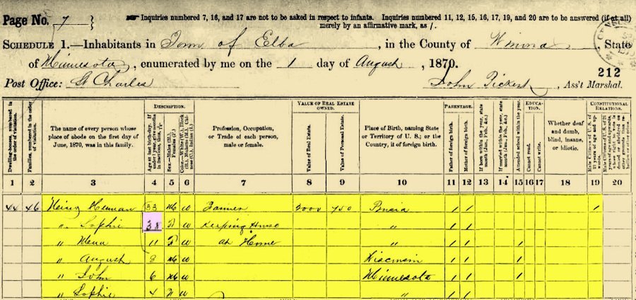 2nd Census for Herman & Sophia by John Prichert 1 Augl 1870