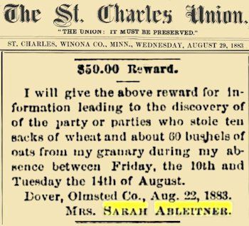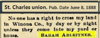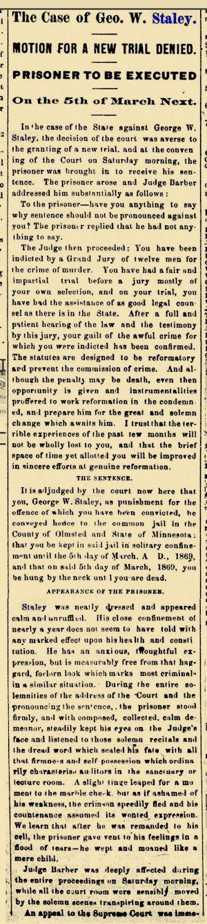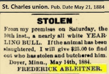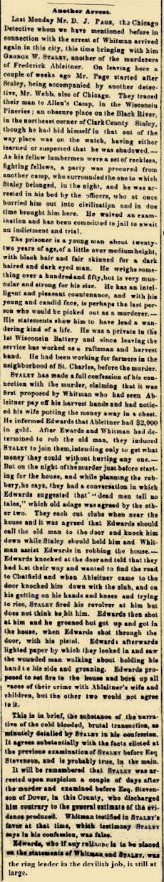 Civil War Veteran, George Winters Staley, was awakened at 3 a.m. at Allen's Lumber camp on Wedge's Creek in Clark Co., Wis. and arrested for the murder of "Fred" Ableitner, a four year resident of Dover, Minn.