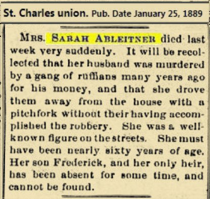 C. F. Ableitner--Murdered in his own house for his money. He two days later, on Halloween night, Oct. 31, 1867.