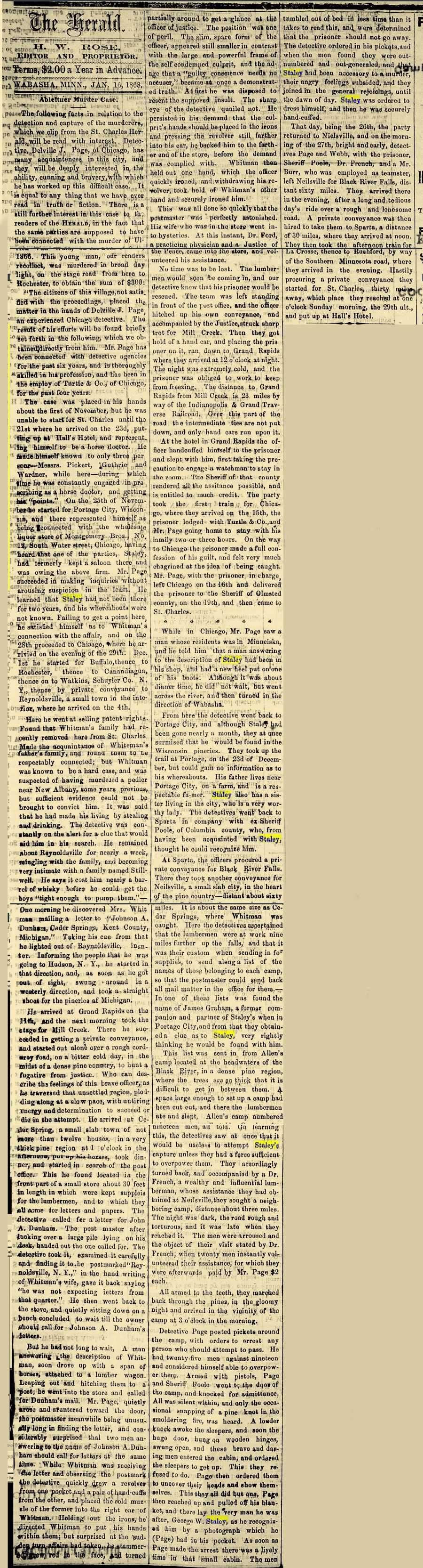 D. J. Page, the Chicago detective, was put upon the witness' stand Friday afternoon and testified as follows: Got on track of Staley by a letter written to him from Portage City, Wis., and directed to St. Charles, Minn. followed him to Allen's lumber camp in Wisconsin arrested him while in bed in the cabin when arrested he wanted to know what he was arrested for told him had but little conversation with the prisoner until evening had conversation with him at Neillsville; Staley commenced the conversation; asked me if I had got the rest of them. Think no one else was present: perhaps the landlord's little girl was present I was sitting by the table and Staley lying on the lounge near him. Took him to 8t. Charles via Black River Falls, Sparta, LaCrosse and Rushville.