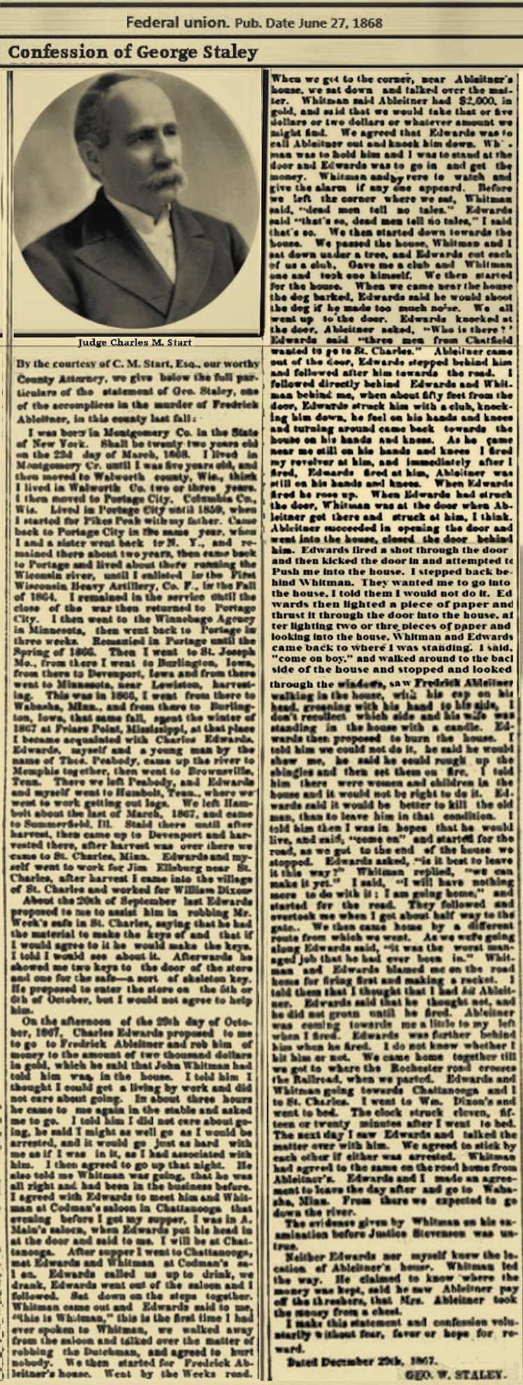 D. J. Page recalled. During the conversation in the hotel at Neillsville, Staley asked me if Whitman told what part they (Staley and Whitman.) performed in the murder. Witness replied that ha did, and that be laid the blame on Charley (Edwards), Staley first getting him into it, and that Whitman charged them with cutting the clubs, but said no one was to be" hurt. Staley remarked that that was not so that he could tell how it was. It was a damn lie that after they got near where Ableitner lived the dogs commenced barking and they all sat down by the fence and talked over the best way of going in after the money. Witness asked Staley who suggested the idea of calling the Dutchman out Staley said it was Charley, that Charley was the one who first went to the door, pretended to have come from Chatfield and inquired the way to St. Charles. Said that they did not intend to kill the man when they went to the door that it was agreed upon that they should call the old man out and knock him down and then go in after the money. I then told Staley that Whitman said it was he who first found out about the money. Prisoner replied that it was a lie that it was Whitman who first spoke of the Dutchman's having money and that it was he who first suggested the idea of robbing him. 8taley further said that Whitman, having thrashed at Ableitner's, saw him pay off the thrashers from money done up in a handkerchief and deposited in an old red chest. Subsequent to the conversation at Neillsville, witness asked Staley how he came to go into the operation. Staley replied that Edwards had a very singular influence over him and that once he drew a pistol on him (Staley) for asking questions. Previous to Staley's confession at St. Charles I held out no inducements that he could turn State's evidence, and do not know of any one doing so The written confession was taken in Dr. Guthries office on Sunday.
