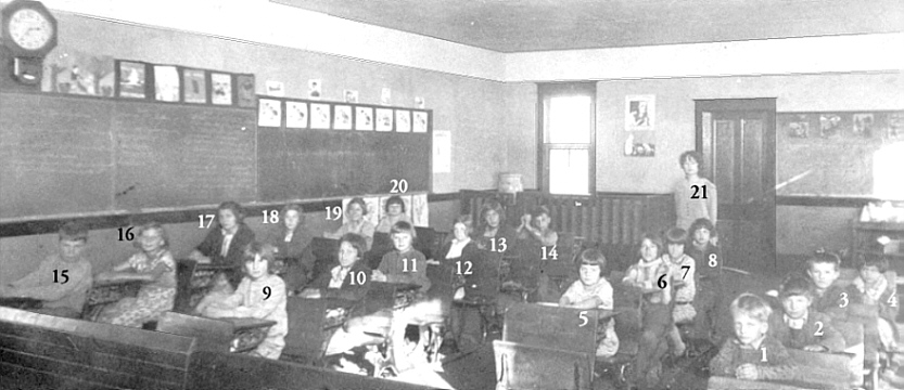 [1.] Ed Ule; [2.] Emil Plautz; [3.] Darwin Kokaly; [4.] Angie (Snedic) Zeug; [5.] Alice Ule; [6.] Frieda (Ticer); [7.] Caroline (Kokaly); [8.] Josie (Snedic) Valenzuela; [9.] Rose (Plautz) Pakiz; [10.] Matilda (Kokaly); [11.] Annie (Jelercic) Huras; [12.] Vickie (Bukovec) Krultz; [13.] Mayme (Zupanc) Gregorich; [14.] Ed Bukovec; [15.] Joe Ticer; [16.] Sophie (Plautz) Matkovich; {17.] Annie (Snedic) Horvat; [18.] Catherine (Jeras) Tratar; [19.] Christine (Gregorich) Bukovec [20.] Ann (Kokaly) Boh [21.] Teacher--Josephine (Jordan) Rayona.