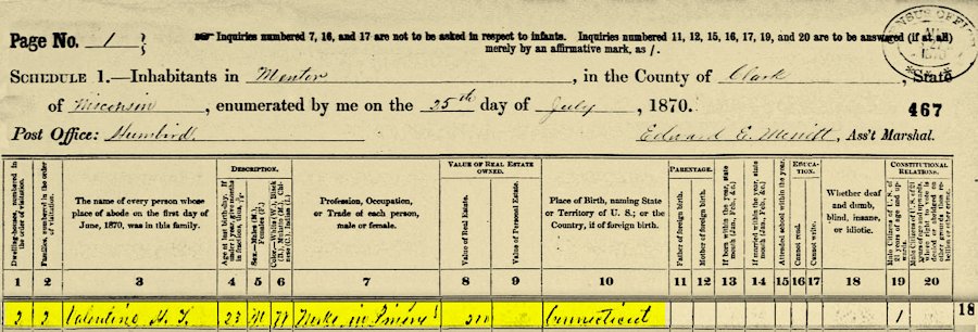 July 25, 1870, Ed Merritt was enumerating the official census for Mentor twp., Clark Co., Wisconsin. After finishing with the Chauncy Young residence, he spoke with twenty three year old H. T. Valentine who worked in the pineries as did many of his neighbors. It was noted that he was born in Connecticut, but both his parents were born in New York. Although Thom was only twenty three years old, he had an estate valued at $500. $1 in 1870 is equivalent in purchasing power to about $21.46 in 2022, an increase of $20.46 over 152 years which reflects his possession at $10, 230 by current rates.