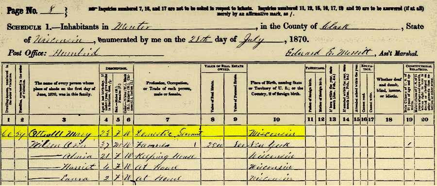 Ed finish collecting his data for the twenty-one year old school teacher, Martha Tripp, July 27th and the next day, the first home he visited was that of the Orin & Alvira Wilson. They had two small girls, 4yr. old Harriet and 2 yr. old Laura as well as a twenty-three year old domestic servant, Mary Ottwell. It is doubtful that Ed had any idea that two hundred and thirty-nine days later Mary would become the wife of Henry T. Valentine. They were married in Humbird, Wisconsin at the home of Bidwell Alderman, by David B. Travis, Esq. March 24, 1872. They had a son named Floyd.