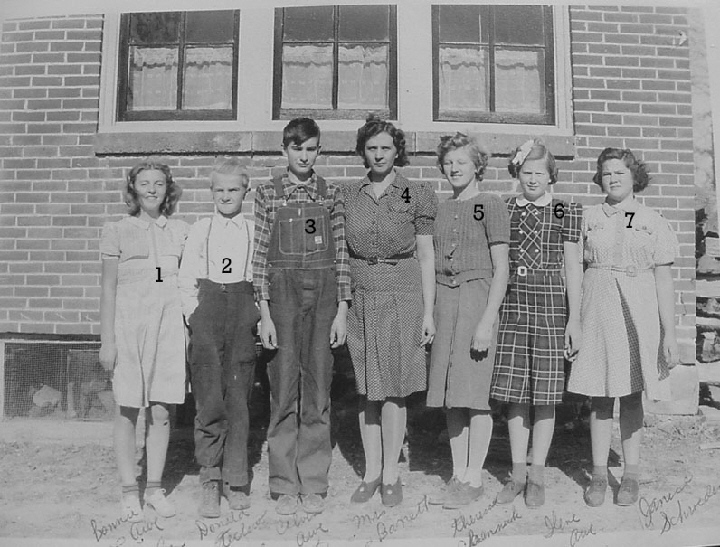 Lined up on the south side of South Bright School in the spring of 1941 are: (1) Bonnie Awe (2) Donald Teclaw (3) Calvin Awe (4) Mrs. (Geneva)Berrett, teacher (5) Theresa Charmnik (6) Ilene Awe (7) Janice Schroeder