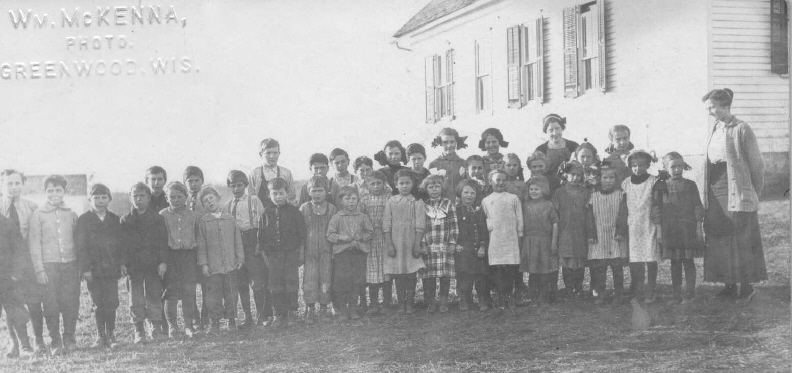 Milt Ystad let me scan the photo above of the students at Christopherson School, which was located in Warner Township, Clark Co., WI, but served students in the western part of Beaver Township, as well. He thought the photo was taken around 1914. The tall boy in the back row, wearing a light shirt and bib overalls is Irvine Rossow. Elsie Rossow (Milt Ystad's mother) is the third person from the right. She has on a light colored dress or pinafore.