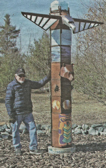 Kirk Rodman stands with the totem pole he designed. This piece and others will