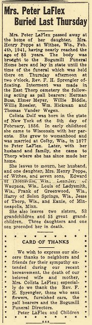 Mrs. Peter LaFlex passed away at the home of her daughter, Mrs. Henry Poppe at Withee, Wis., Feb. 4th, 1941, having nearly reached the age of 85 years. The body was brought to the Bogumill Funeral Home here and lay in state until the time of the funeral which was held there on Thursday afternoon at two o’clock, Rev. F. H. Sprengler officiating. Interment was made in the East Thorp cemetery the following acting as pall bearers: Herman Buss, Elmer Meyer, Willie Biddle, Willie Roesler, Wm. Hickman and Thomas Vander Wegen.