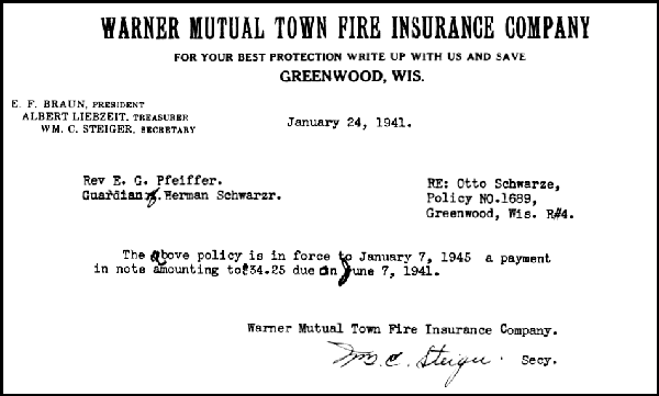 In 1941, the Warner Mutual Town Fire Insurance Company President was E. F. Braun. The treasurer was Albert Liebzeit and Wm. C. Steiger was the secretary. Below is a document issued by the Company for Herman Schwarze while Rev. E. G. Pfeiffer was his acting guardian after he could no longer care for his own affairs.