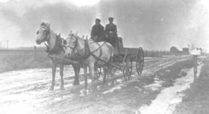 This picture post card below is a scene on Hwy 98 on April of 1913. The two men are Fred & Jim Francis. The Francis farm was about a mile east on Hwy 98 from the Hwy 73/98 intersection. Look at the great roads they had to deal with in the spring!