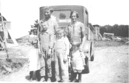 The Ernest Sanger Family in 1927 posing by the old familiar Model T belonging to Emma's father, Oscar Franke. Both Mr. and Mrs. Sanger spent childhood years in Fremont Township, and then 42 years of their married life farming 80 acres a few miles away from Chili. After 15 retirement years near Loyal, Emma Sanger has now returned to Chili, and is living in the former Herman Montag store. (Elmer lives in Rockford; Lawrence is a Chaplain, now in Germany; Evelyn is Mrs. Alvin Roehl, Chili - a Loyal school teacher; and Mildred is Mrs. Norman Faber, rural Granton).