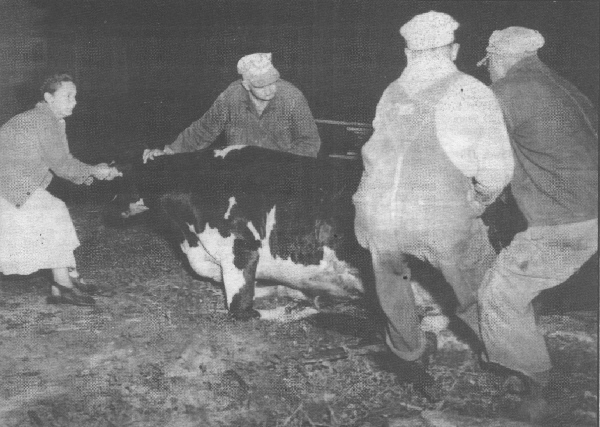 The picture herewith shows Luella and Albert pulling at the cow’s head and two friends helping (as the ropes had slipped), they got Molly on her feet again on the solid ground. Molly only sustained some bruises and scrapes and joined the cowherd again.