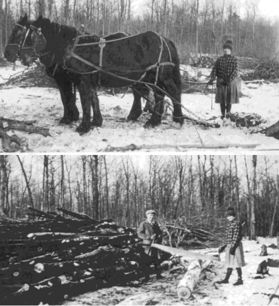 My parents are pictured below while "making wood" for the cold Wisconsin winter's fires in Longwood Township, Clark Co., WI. I have no idea when the photo was taken, but am assuming it was sometime in the late 20's or early 30's. They were married in 1927. The horses were named Dick & Dub.