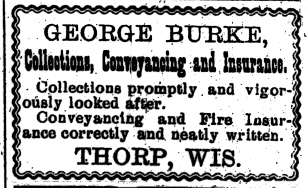 Below is an ad from the 7-Oct-1909 edition of the Thorp Courier featuring the Collection, Conveying and Insurance business of George Burke, Thorp Wisconsin.