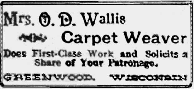 Mrs. Orzina Dean Wallis' Carpet Weaving business of Greenwood, Wisconsin was featured in this Greenwood Gleaner ad of 16-Mar-1900.