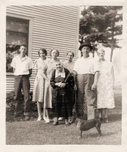 Behind her, from right to left: Hattie Berg (Mrs. Arthur Berg), Uncle Charlie, Lottie Berg, Elva (Berg) Fenske, Pearl Berg, unknown male cousin. The photo was probably taken in the late 1930's because Amelia passed away in 1940. Melissa Guensler |