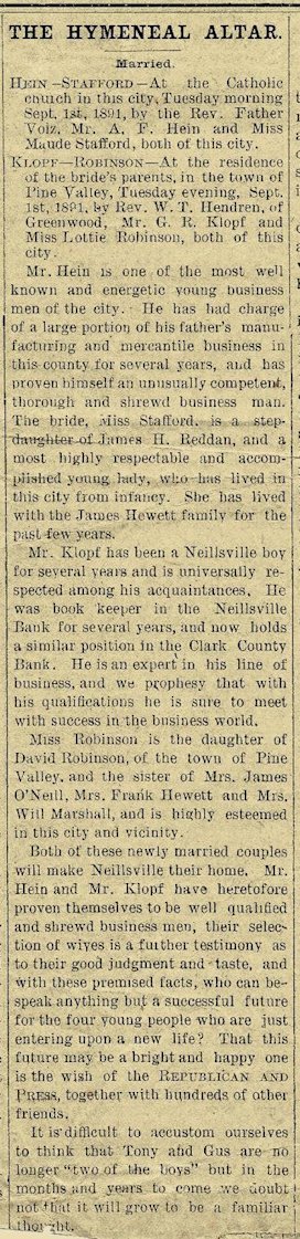 Mr. Hein is one of the most well known and energetic young business men of this city. He has had charge of a large portion of his father's manufacturing and mercantile business in this county for several years, and has proven himself an unusually competent, thorough and shrewd business man. The bride, Miss Stafford, is a step-daughter of James H. Reddan, and a most highly respectable and accomplished young lady, who has lived in this city from infancy. She has lived with the James Hewett family for the past few years. Mr. Klopf has been a Neillsville boy for several years and is universally respected among his acquaintances. He was book keeper in the Neillsville Bank for several years, and now hold a similar position in the Clark County Bank. He is an expert in his line of business, and we prophesy that with his qualifications he is sure to meet with success in the business world. Miss Robinson is the daughter of David Robinson, of the town of Pine Valley, and the sister of Mrs. James O'Neill, Mrs. Frank Hewett and Mrs. Will Marshall, and is highly esteemed in this city and vicinity. Both of they newly married couples will make Neillsville their home. Mr. Hein and Mr. Klopf have heretofore proven themselves to be well qualified and shrewd business men, their selection of wives is a further testimony as to their good judgment and taste, and with this premised facts, who can bespeak anything but a successful future for the four young people who are just entering upon a new live? That this future May be a bright and happy one is the wish of the REPUBLICAN AND PRESS, together with hundreds of other friends. It is difficult to accustom ourselves to think that Tony and Gus are no longer "two of the boys" but in months and years to come we doubt not that it will grow to be a familiar thought.