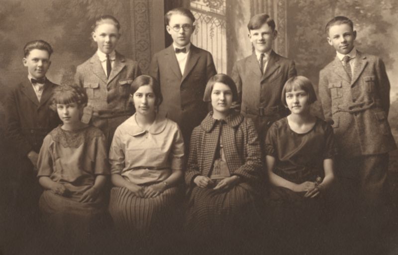 Roslyn Warlum (1910) Standing (L>R): Kenneth Ross Smith, Clarence Herbert White, Elliot Warlum (1909), Red (Rawleigh Arthur) Smith, Glen White *Contact us if you know the occasion for this "Thayer Studio" photo. Teachers’ training course in Neillsville high school? |