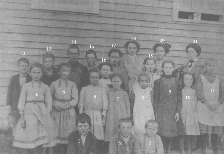 1) Tom Yndogliato 2) Frank Yndogliato 3) Louie Yndogliato 4) Emma Gehrt 5) Elsie Gehrt 6) Grace Zank 7) Tina Lloyd 8) Marie Mohr 9) Vera Lloyd 10) Vera Christianson 11) Bertha Mohr 12) Robert Grinnell 13) Art Pflughoeft 14) Fred Mohr 15) Louie Lloyd 16) Eunice Lloyd 17) Blanche Christianson 18) Ada Quinnell 19) Viola Suchow 20) Elizabeth Yndogliato 21) Teacher