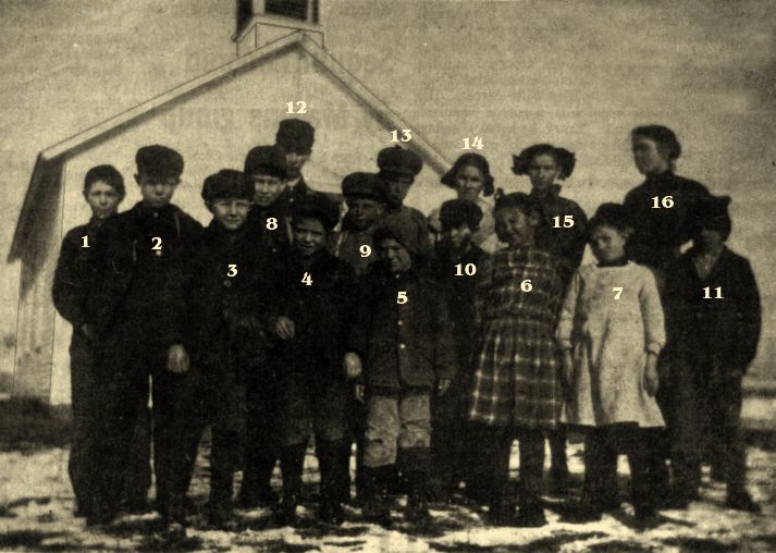 1) Eugene Moffet 2) Willard Moffet 3) Perschy Moffet 4) Ray Albert 5) Laura Haskins 6) Clara Mowerstadt 7) Ralph Lowell 8) Heczkiah Haskins 9) Earl Marden 10) Richard Albright 11) Earl Lowell 12) Charles Marden 13) Paul Albright 14) Hazel Wiesner 15) Ruth Pollno 16) Vera Scherholtz (teacher)