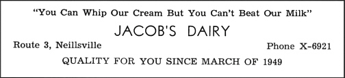 "You can Whip our Cream But You Can't Beat our Milk" Jacob's Dairy Route 3, Neillsville Phone X-6631 QUALITY FOR YOU SINCE MARCH OF 1949