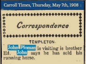 Laura Meaike Ploman 8 Apr 1897, Audobon, IA–17 Oct 1975, Marshfield, WI; Charles August Ploman 10 Jul 1898, Minilla, IA–1976, National City, CA; Anna Schofield Ploman 27 Mar 1900, Audobon, IA–24 Oct 2002 Chippewa Falls, WI; Helena Ploman 27 Oct 1902, Shelby, IA–23 Oct 1983, WI; Frederick Dick Ploman 24 Jan 1903, Gray, IA–14 Aug 1978, Loyal, WI; Infant Ploman 1 Apr 1906–1 Apr 1906; Edward John Ploman Jr. 14 May 1907, Templton, IA -1980 in Loyal, WI; Rose Alice Dietsche Ploman 18 Jul 1909 in Templeton, Carroll Co., IA–24 Apr 2005 in Marshfield, WI; Selma Rueth Ploman 30 Nov 1911 in Newton twp. Carroll, IA–bef. 2012; Infant Ploman 22 May 1913–22 May 1913; Bertha Mae Ploman 11 Dec 1914–2002, Dedham, Carroll Co., IA-4 Nov 2002, Walnut Creek, Contra Costa, CA; Walter Ploman 1918-bef. 2017