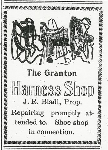 The ad below for the J. R. Bladl Harness shop was featured in Granton News.