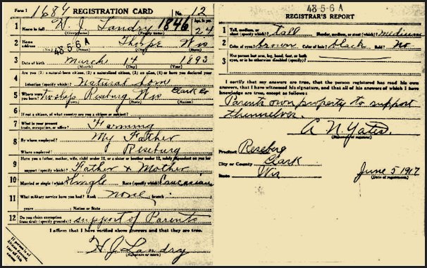 Name: H. J Landry Sex Male Registration Date from 1917 to 1918 Place Clark, Wisconsin, United States Citizenship Place United States Birth Date 14 Mar 1893 Birthplace Reseburg, Wisconsin, United States Race Caucasian Affiliate Publication Number M1509 Affiliate Publication Title World War I Selective Service System Draft Registration Cards |