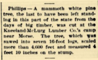 The mill at Morse was never able to handle all the logs brought in by the railroad. From 1918 until 1922 K-M would run log specials with their own equipment over the SOO Line tracks from Morse to their other mill at Phillips. Following 1922, logs were hauled to Phillips in conventional SOO Line trains. The Morse mill eventually closed on Dec 12,1926. Kneeland-McLurg Lumber went out of business in 1932. |