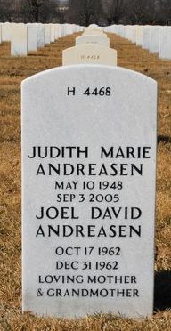 Joel David Andreasen was born 17 Oct 1962 and died when he was 2 months old., jus after Christmas, 31 Dec 1962 . He was buried in the Fort Snelling National Cemetery in Minneapolis, Hennepin County, MN.in Section H, Site 4468 |