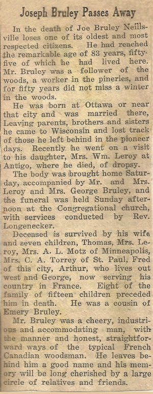 Mr. Burley was born in the province of Quebec, Canada, and when a mere boy began the life of a woodsman and riverman. For 50 consecutive winters he worked in a lumber camp, a record that has been equaled by few. He was not only competent in all lines of camp work, but was a capable man in many ways and found employment at times when other men were out of employment. He was married in Canada to Miss Kate Bone, and came to Clark County about 55 years ago, coming in from La Crosse with an ox team. To the hardy pioneer men and women of their type who braved the wilderness and struck the first hard blows for civilization, the people of the present days owe a great debt of gratitude; they laid the foundation of all we enjoy today. Mr. Bruley is survived by his wife and seven children: Thomas who is here at present; Mrs. Wm. Leroy of Antigo; Mrs. A. L. Motz of Minneapolis; Mrs. C. A. Torrey of St. Paul; Lieut. George Bruley with the U.S. Army in France; Arthur, somewhere in the West, and Fred of Neillsville.