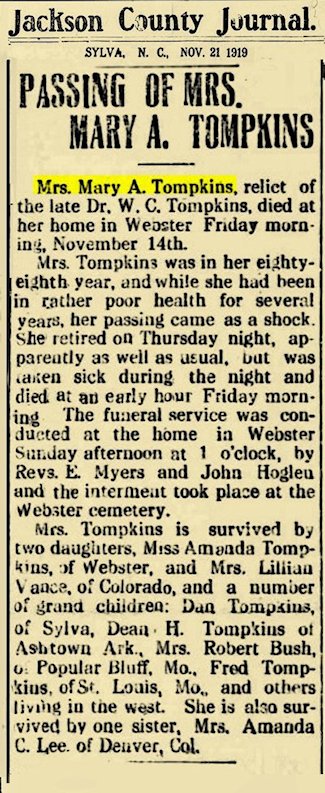 Obit: Tompkins, Mary A. Grove (1850-1919)