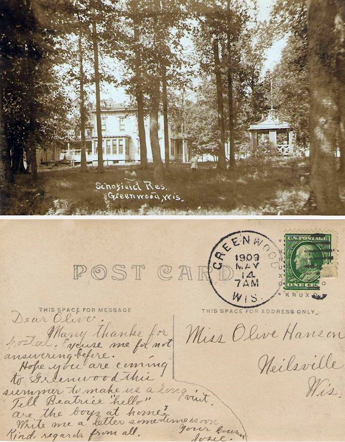 [Postcard] from cousin Josie of Greewood to Olive Hanson of Neillsville