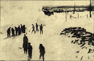 At the Tioga Crossing, 3 1/2 miles south and 3 1/2 miles west of Willard, hand shoveling snow was a common practice on the F & N.E. during winter months. the locomotive pilot and crew hand shoveled the snow to clear the tracks. At this particular time, it looks as though some Tioga area residents came to help with the removal. |