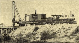 The F&N.E. Railroad crossed a bridge on Thompson Creek, a mile south of Tioga. J. Foster Adams took this picture of the rented Omaha pile driver as the F&N.E. bridge was being repaired, June, 1905. |