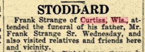 Frank Strange Jr. resided in Curtiss, Clark Co., Wisconsin in 1921. He was the son of Frank Strange Sr. (1846-1920) who immigrated to the United States of America in 1889 and never became a naturalized citizen. Frank Sr. died in Stoddard, Vernon Co., Wisconsin the the Fall of 1921 and Frank Jr. did attend the funeral where he visited friends and relatives, including his cousins Martha & Herman Asp.