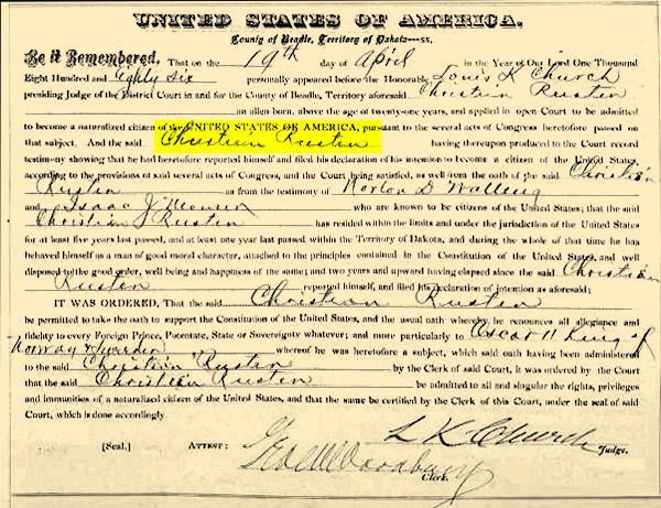 April 19th, 1886 Christian, having previously filed his intention to become a citizen of the USA, stood before the Honorable Louis K. Church District Court Judge of Beadle Co., SD Territory and gave his testimony showing his oath of allegiance. He was April 19th, 1886 Christian, having previously filed his intention to become a citizen of the USA, stood before the Honorable Louis K. Church District Court Judge of Beadle Co., SD Territory and gave his testimony showing his oath of alligence to his adopted country. Norton D. Wallerig and Isaac J. Neouren, both US citizens, testified to his residence within the Territory of Dakota for the required five years and confirmed his good moral character who behaved himself according to the Constitution of the USA. The mandatory two years had elapsed since Christian's declaration of intent. Having renounced all allegiance and fidelity to every Foreign Prince, ruler, State or Sovereignty, and to Oscar King of Norway and Tuerden, Judge Church certified his citizenship under the court seal. George Edw. Woodbury attested to the event and Christen left the Courthouse, an American Citizen. |