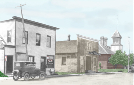 Pictured below is the building once owned by B. B. Green of Curtiss, Clark County, WI. To the right of it is the Ecke Meat Market followed by the Old Curtiss School House, with a sign posting a speed limit of 8 mph.