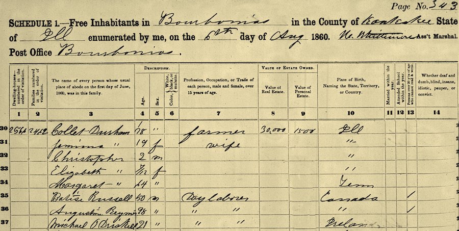 1860 Federal Census; Bourbonnais, Kankakee, Illinois, 6 August, enumerated by N. Wittemore, Marshal.