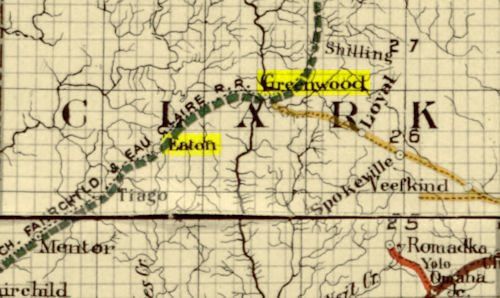 ----Sources: 1900 Railway Map, Greenwood, "Hub of Clark County, Wis."